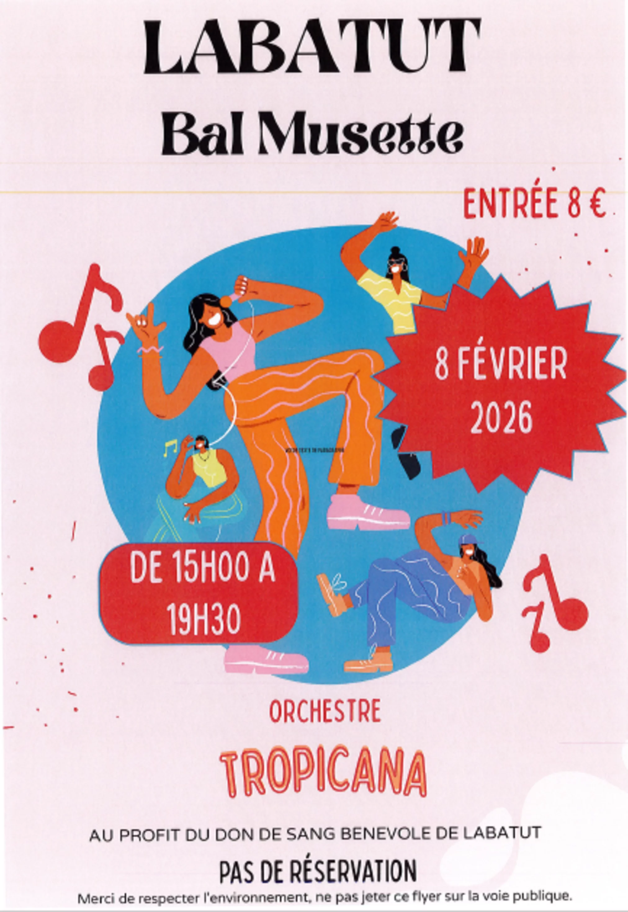 Venez au Bal Musette, le dimanche 08 février 2026 de 15h à 19h30 à la salle des fêtes de Labatut au profit du don de sang organisé par les bénévole du village.