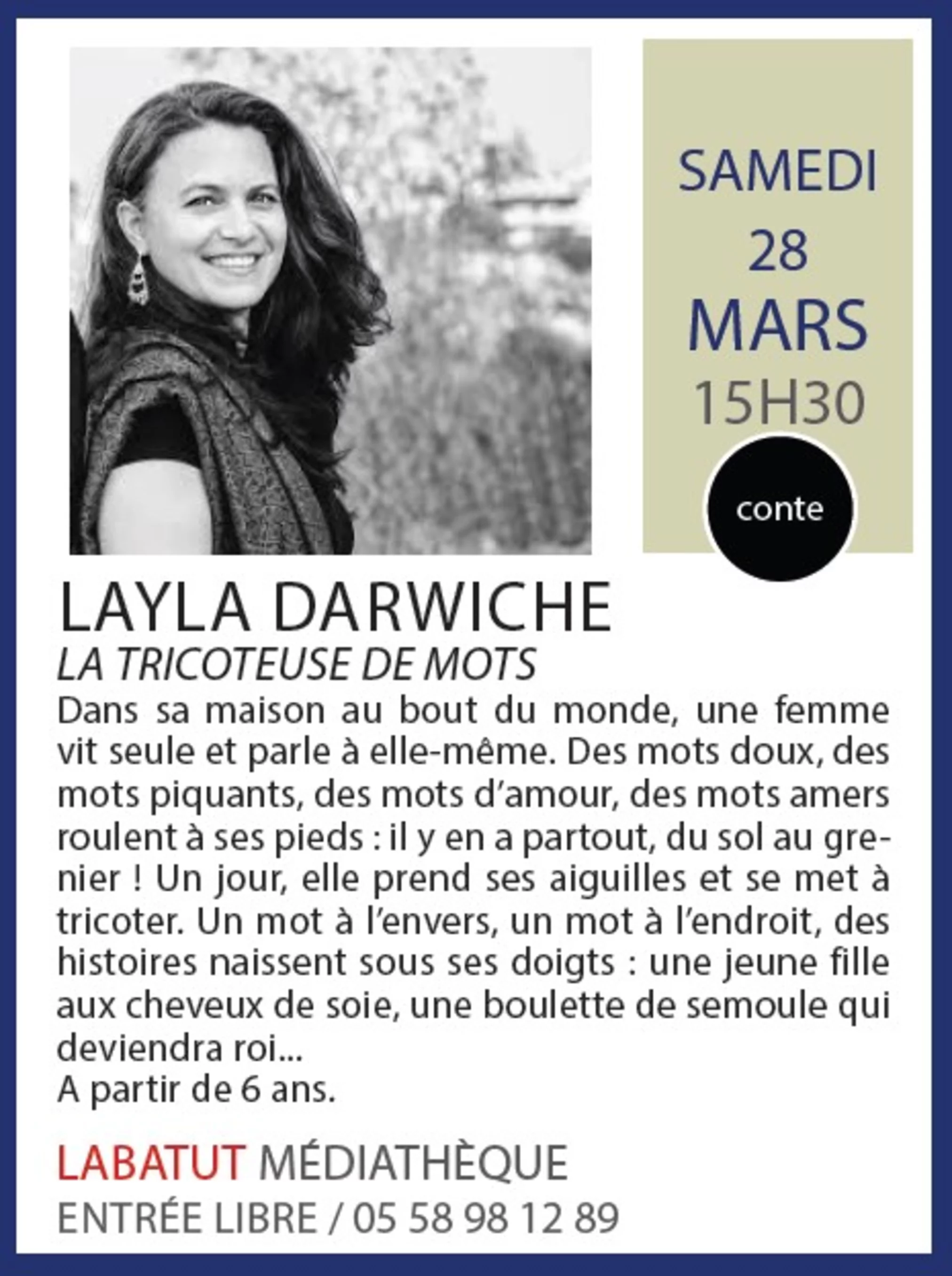 Dans le cadre du festival l'émoi des mots, organisé par l'association l'Atelier du mot, la médiathèque de Labatut reçoit Layla Darwiche pour son spectacle "la tricoteuse de mots" . Des mots doux, des mots piquants, des mots d’amour, des mots amers roulent à ses pieds : il y en a partout, du sol au grenier !