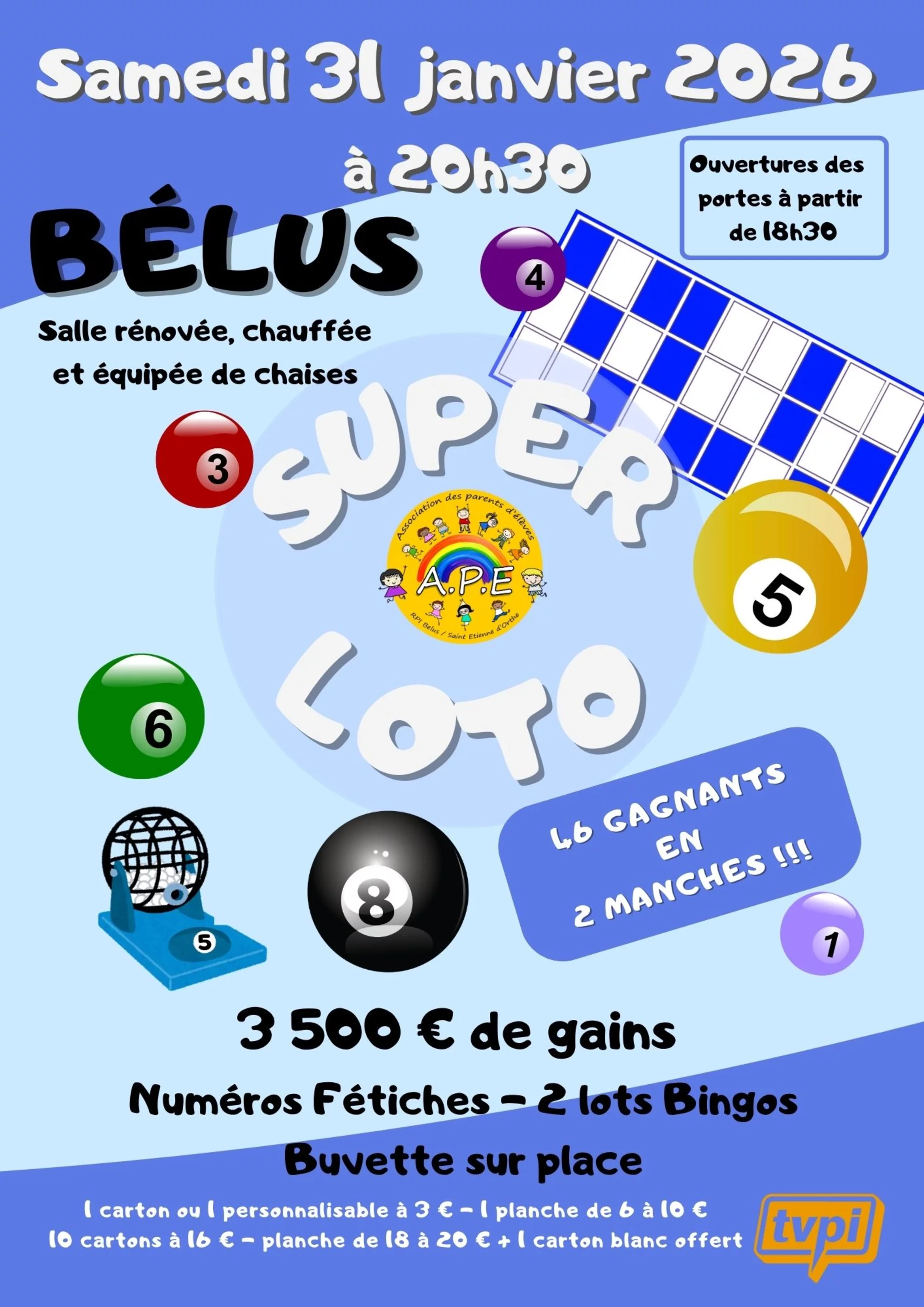 Loto Bingo à Bélus organisés par l'Association des Parents d'élèves de Bélus! Jusqu'à 3500€ de gains! La salle sera ouverte à partir de 18:30 et ne vous en faites pas, il y fait bon!