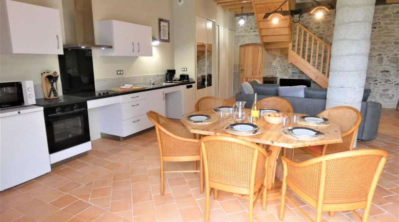 L'Écogite dispose d'une entrée et d'un accès privatif depuis sa terrasse en bois, équipée d'un salon de jardin, de transats et d'une plancha. En RDC accessible PMR, vous trouverez une pièce de vie avec salon, salle à manger (poêle à granulés) et cuisine équipée, une chambre (1 lit160x200), une salle d'eau avec WC. À l'étage, deux chambres (1 lit en 160x200 / 2 lits en 90x200) et un cabinet de toillette. Draps, linge de toilette et de maison, eau, chauffage et ménage fin de séjour inclus. Prêt de vélos. Equipement bébé à la demande. Gîte non fumeur. Forfait cure